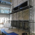 建物内の重要な動線上に位置する2本の構造柱を活用し、迫力の70インチ大型ディスプレイを高所に設置するための専門施工の様子です。 安全性を最優先に設計された特注足場を構築し、作業環境を確保。 重量のある大型ディスプレイを壁面から離れた位置の梁から固定するための特殊金具と高度な取付技術により、建築物との一体感を実現しました。