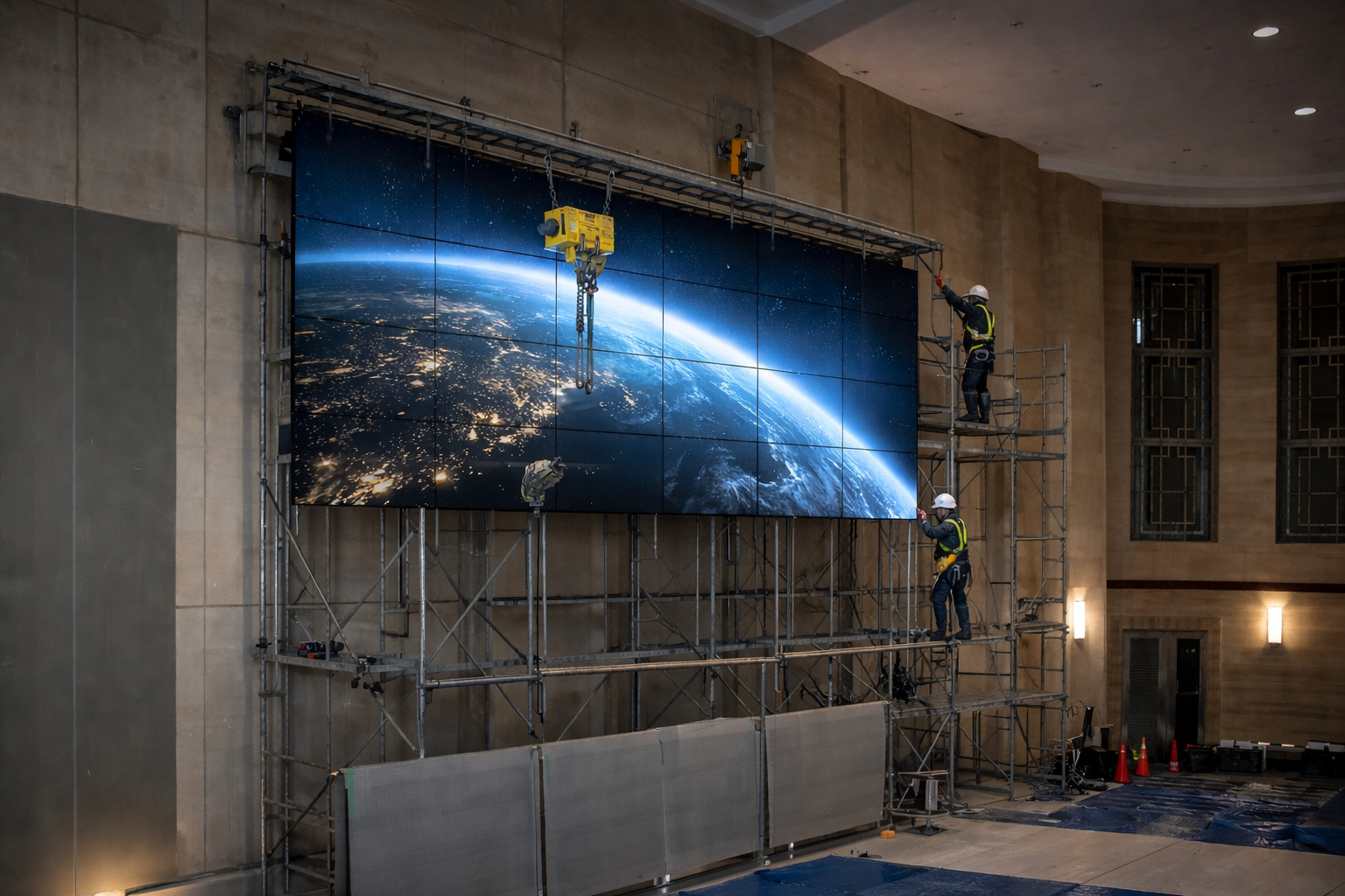 一面あたり25kg以上もある高精細ディスプレイを正確に位置決めするため、電動ホイストによる精密な揚重作業を実施。 重量物を安全かつミリ単位の精度で取り付けるこの技術により、継ぎ目のない完璧な映像体験を実現する大型ビジュアルシステムの構築に成功しました。