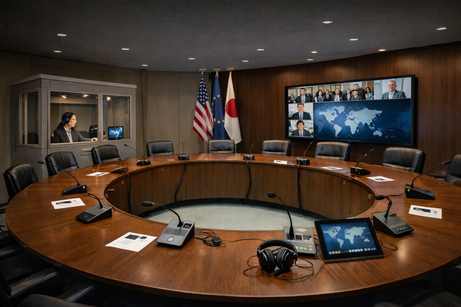 既存環境を活かした費用対効果の高いグローバルコミュニケーション基盤 — 役員会議室向け統合型同時通訳ソリューション。